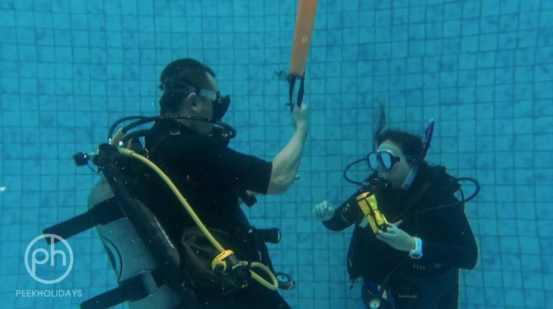 After that, then we started the session with mask clearing, take off and wear our mask back followed by how to do air sharing if our dive buddy runs out of air, and so on – all those skills that we have learned before during our Open Water Course that we hope we never need to do it in real. We were supervised one by one when doing it so that our Instructor could correct us if we did it wrong.