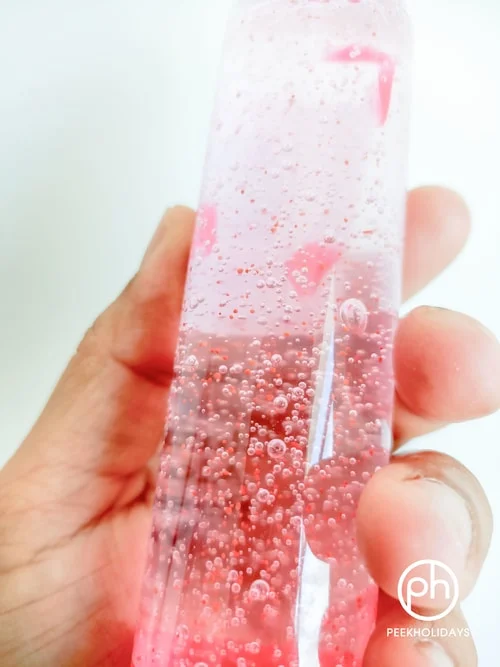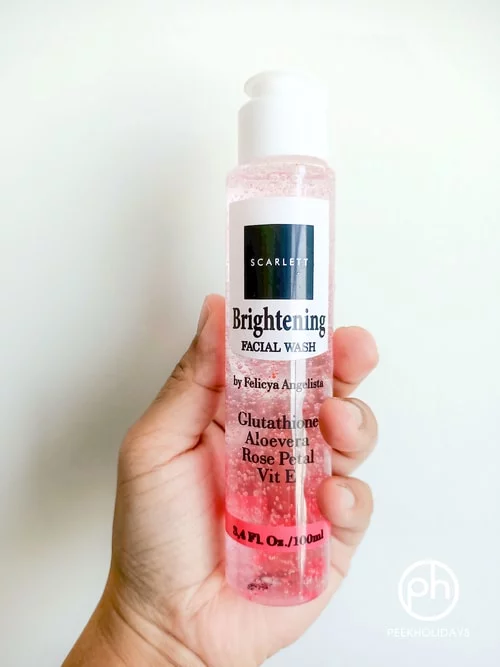 Scarlett Brightening Facial Wash comes in a light pink 100 ml slim translucent bottle that is good for our hand grip. It won’t slip off our hands easily when we are pouring it out. It also has a sweet and floral scent that I love; I can smell it as I cleanse my face with a pleasant aroma. As shown in the photos above, we can see a few rose petals, beads, and bubbles formed in the facial wash liquid.
