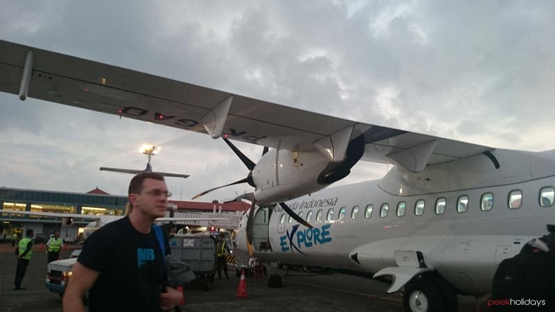 The sky was still dark when I reached the airport and it’s also cloudy, luckily it’s not raining. When I saw the propeller plane we’re taking, I was kinda in between happy and amused because that’s my first time taking such a small plane for domestic route. I just found out that this Explore ATR72-600 by Garuda Indonesia was just launched about 2 years ago to cater destinations with smaller airports in eastern part of Indonesia. It caters up to 70 passengers and all in economy class. So, if you usually take business class, then you can forget about it here.