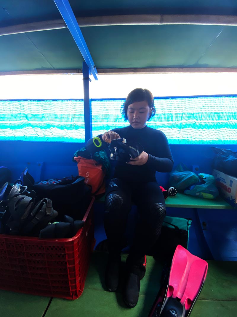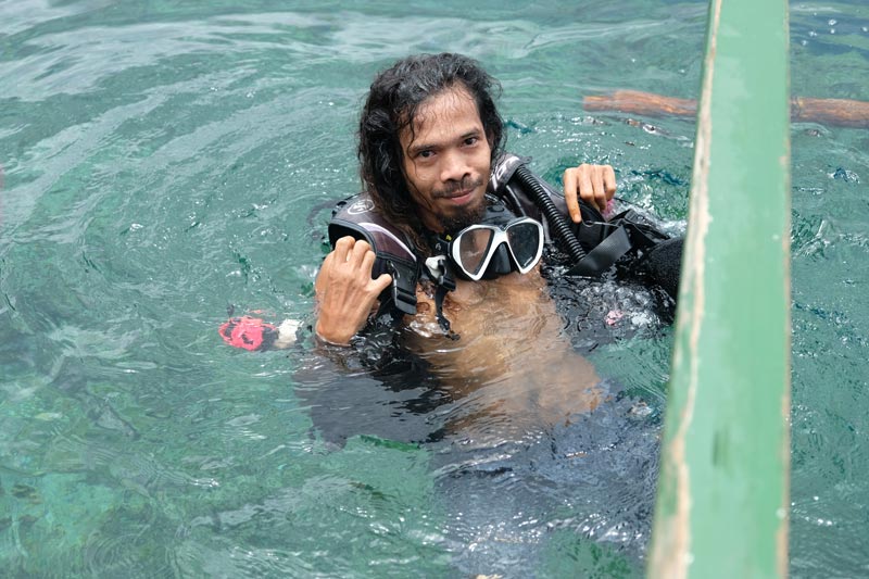It was raining hard the night before, and I thought the sky would be clear the next morning. However, it didn’t. It was cloudy for almost the whole day. We still proceed to dive at Goa Loba-Loba as we only had that day freed from any other activities. Only me and Ipin, the DM that I first met in Gili one year ago, dived that day. At the same time, the rest of my friends were snorkeling around at the same spot. Not all; a few were staying on the boat enjoying the breeze.