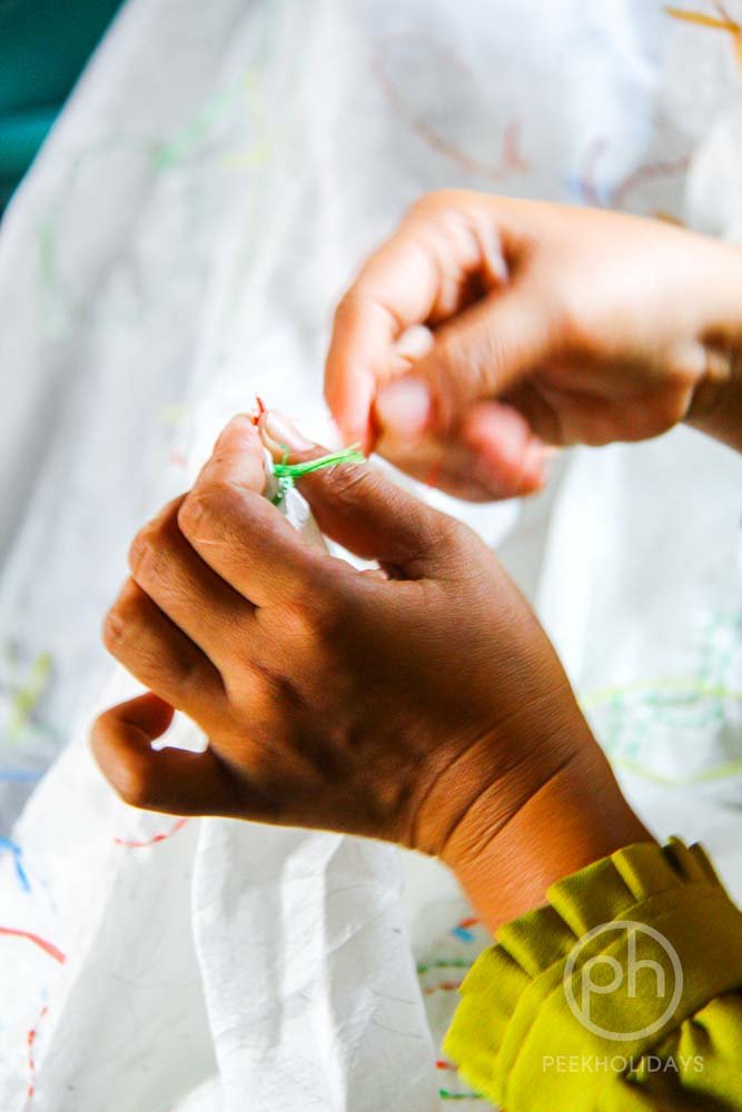 Though it is not limited to these choices, they usually use cotton and silk. After the tracing stage, they will start tying the part meant to stay without color with very fine raffia. I think the tying step needs another whole new level of patience, and I don’t think I have such long patience—one pinch by pinch, from one end to the other end of the cloth. When I saw how smooth and fast they do that, I could only stand aside watching and taking photos of them.