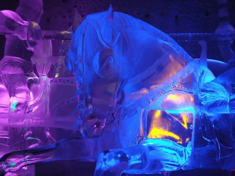 We were all there in front of the big wooden door of the building, the guide unlocked it and one by one, we went in. From our first step in there, we could already see the various shape of sculptures – from the sculptures standing on the ground up to the one hanging on the ceiling, everything was made from ice. They put up some LED lighting to illuminate without warming the ice sculptures. The place was lit up with colourful lighting.