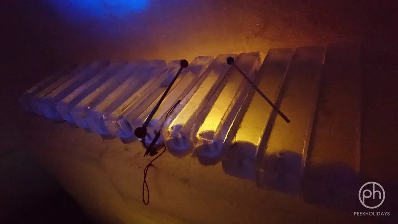 Within the museum, they have created a two-story observation tower with a circular staircase, life-size jousters on horseback, a polar bear bedroom, a Christmas tree bedroom, a kid’s 2 story fort bedroom and a Northern Lights room with an ice outhouse made exclusively with Alaska Diamond or Alaska Marble ice. There is also a room with an ice musical instrument which actually really makes a beautiful sound like in a real musical instrument.